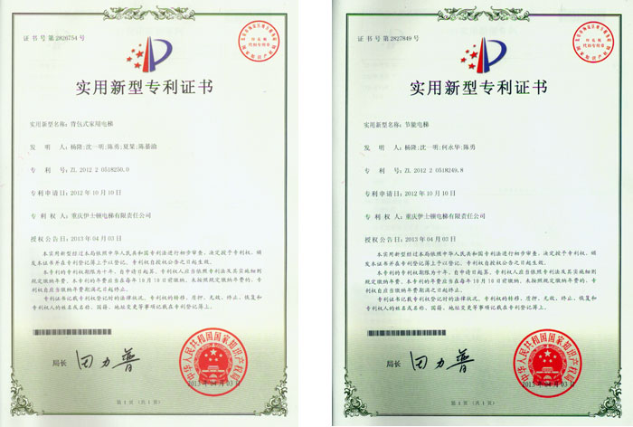 “伊士顿”喜获三项实用新型专利证书2013年04月03日,“伊士顿”再次荣获国家知识产权局颁发的“背包式家用电梯(ZL 2012 2 0518250.0)”、“节能电梯(ZL 2012 2 0518249.8)”、“无机房电梯(ZL 2012 2 0549058.8)