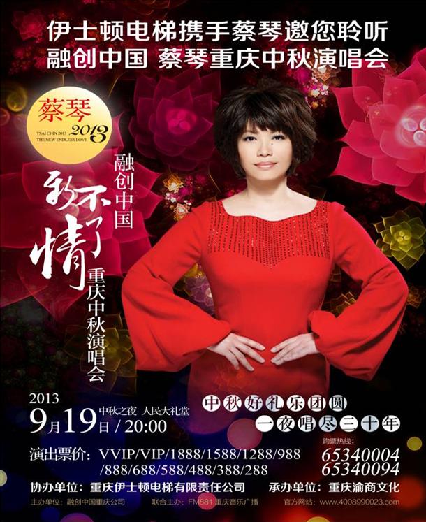 “伊士顿”蔡琴中秋演唱会即将启幕2013年9月19日,时值中秋佳节,一场令人回味无穷的演唱会将在重庆人民大礼堂隆重上演,这是重庆伊士顿电梯有限责任公司倾情打造的一台高雅音乐盛典。 此次“伊士顿”蔡琴